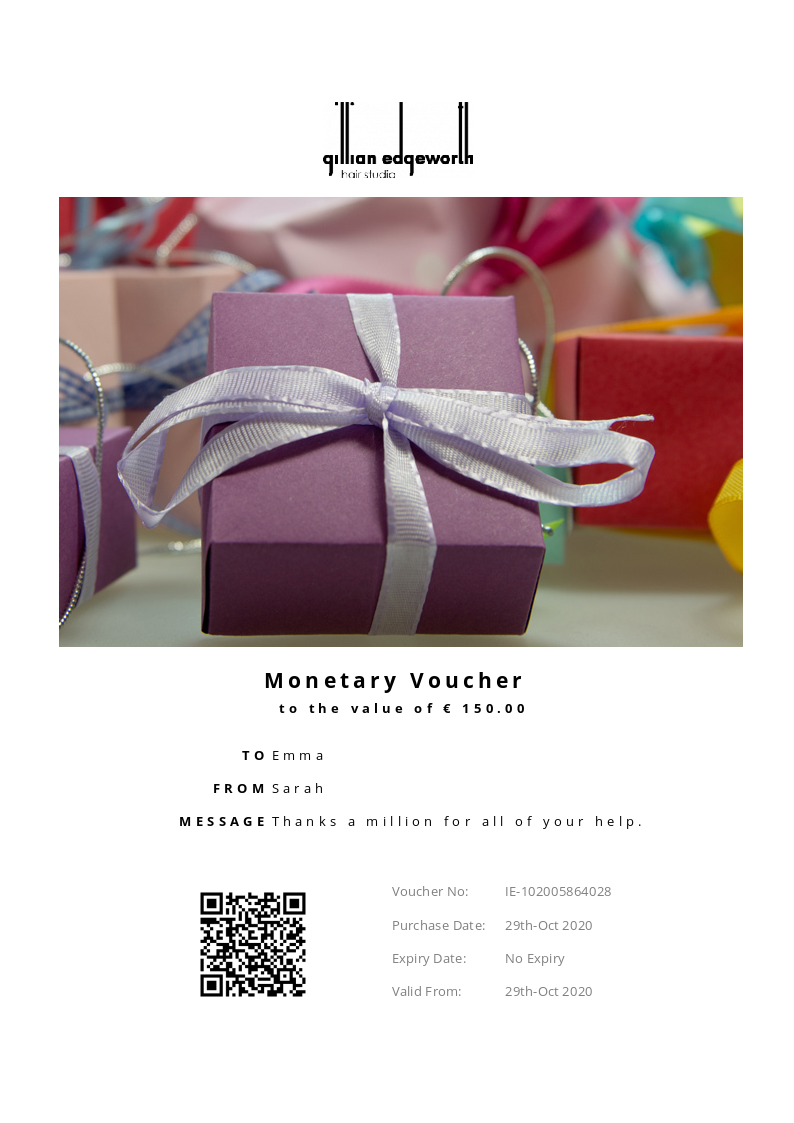 Gillian Edgeworth allows you to purchase instantly printable gift vouchers, special offers and tickets using the Voucher Connect platform.